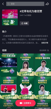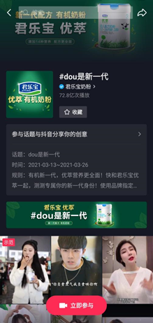 作为节目的独家冠名商,君乐宝优萃有机奶粉可谓“无处不在”,基于双方调性与内涵的双重契合以及抖音娱乐化营销生态助阵,为品牌流量与形象带来了双丰收。在品牌热度上, #dou 是新一代 # 优萃有机为歌而赞 等话题聚合了大量品牌优质内容,截至目前,两个话题下的内容获得了超 72 亿的观看与互动,引发传播的涟漪效应,有效承接节目热度,